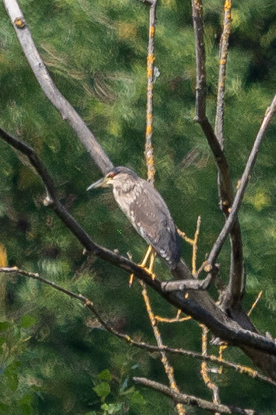 Le héron cendré est un hôte fréquent ici. Il est accompagné d’un bihoreau gris (ici immature) plus rare.